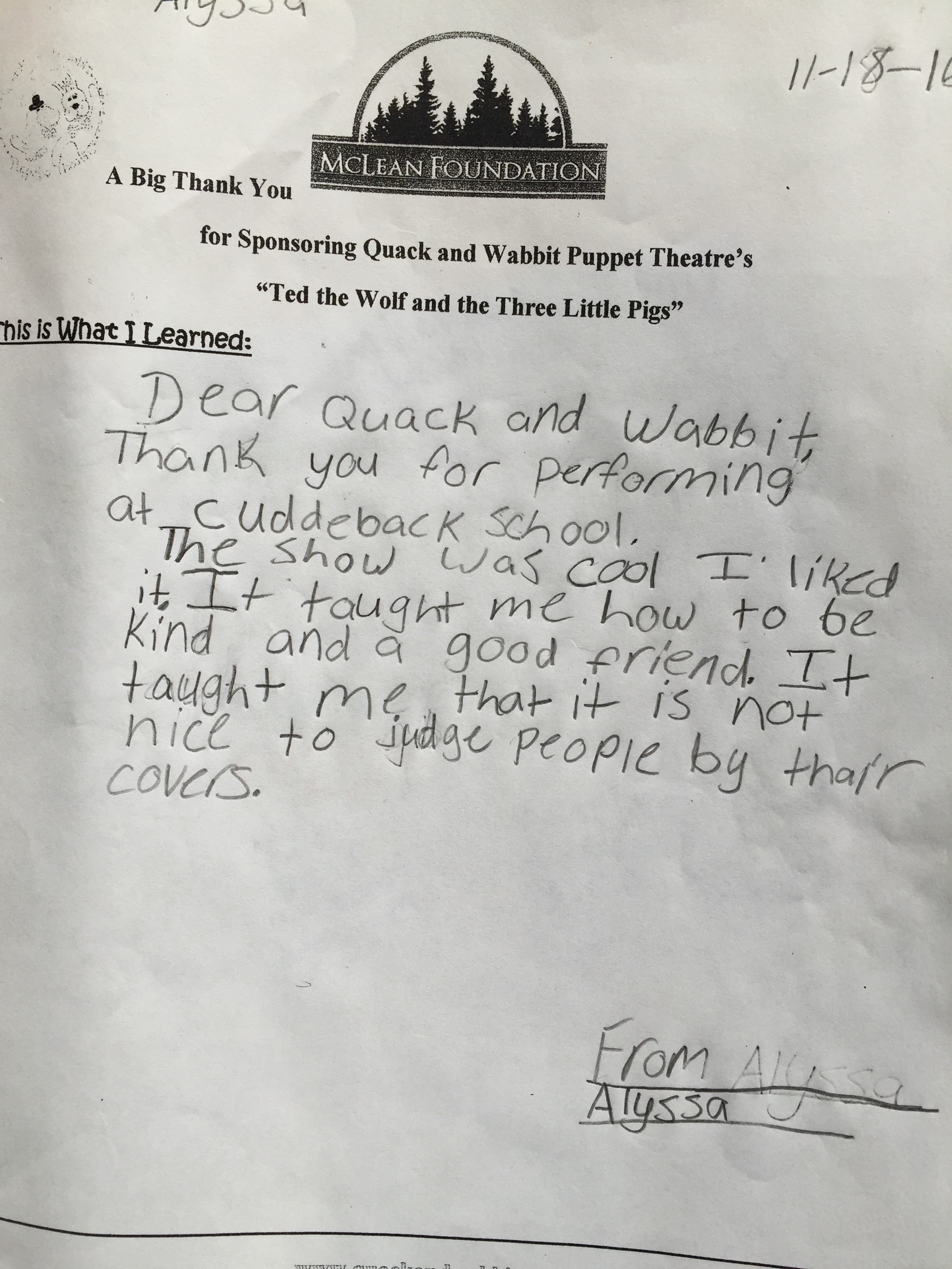 We present puppetry workshops for children and teachers throughout northern California, along with Teaching Tolerance Workshops for teachers and school personnel. Quack and Wabbit Puppet Theatre has been creating and touring in original entertaining and educational puppet shows for the past 18 years. We have toured our programs throughout Humboldt County, Del Norte County, and the San Francisco Bay area.